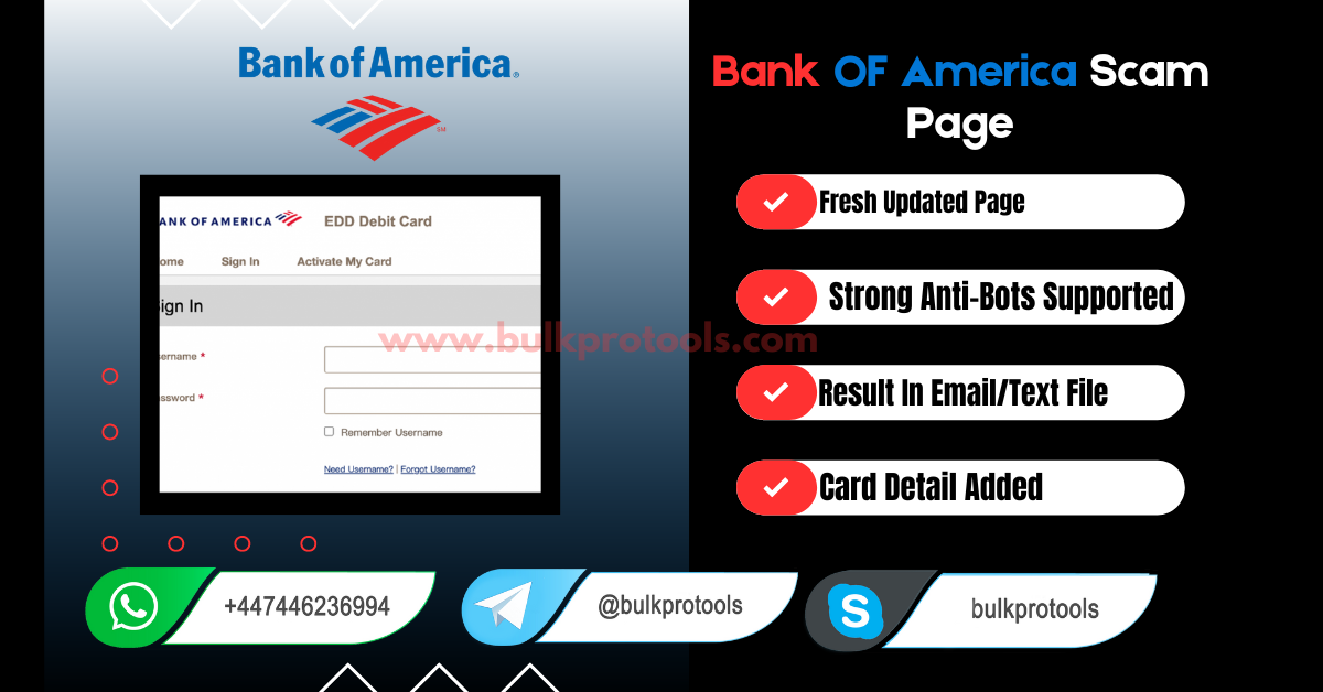 Introducing a new and full functional Bank of America scam page with auto email support and automatic redirection to the official domain. This fresh, 2021 design includes full account security verification and delivers a highly informative user experience. Our Bank of America scam page is fully undetectable, featuring an auto logo and updated anti-bot protection. It’s compatible with both mobile and PC, with card verification seamlessly integrated. The page also redirects to the original Bank of America website and is available in clean HTML coding for easy implementation.